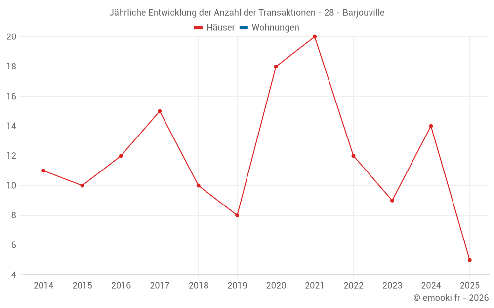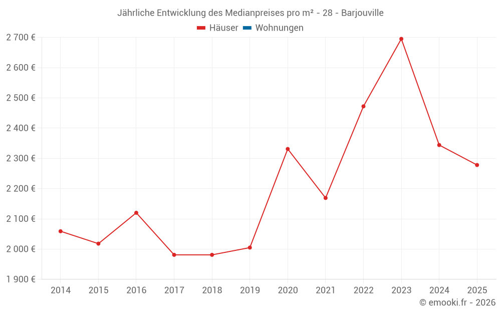 Der Durchschnittspreis auf den 26 Hausgeschäften der letzten 24 Monate in der Gemeinde Barjouville betrug 2 560 € pro Quadratmeter für einen mittleren Immobilienwert von 238 000 €. Über diesen Zeitraum hinweg lagen 60% der Transaktionen zwischen 2 031 und 3 125 € pro Quadratmeter (vom 2. bis zum 8. Dezil).