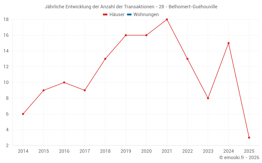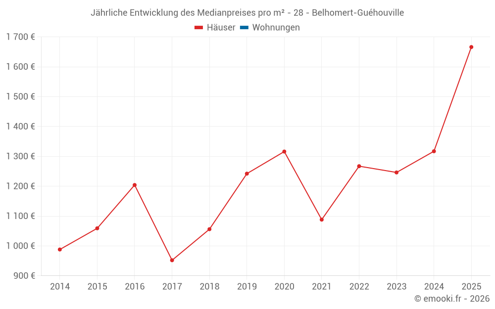 Der Durchschnittspreis auf den 21 Hausgeschäften der letzten 24 Monate in der Gemeinde Belhomert-Guéhouville betrug 1 303 € pro Quadratmeter für einen mittleren Immobilienwert von 117 000 €. Über diesen Zeitraum hinweg lagen 60% der Transaktionen zwischen 960 und 1 652 € pro Quadratmeter (vom 2. bis zum 8. Dezil).