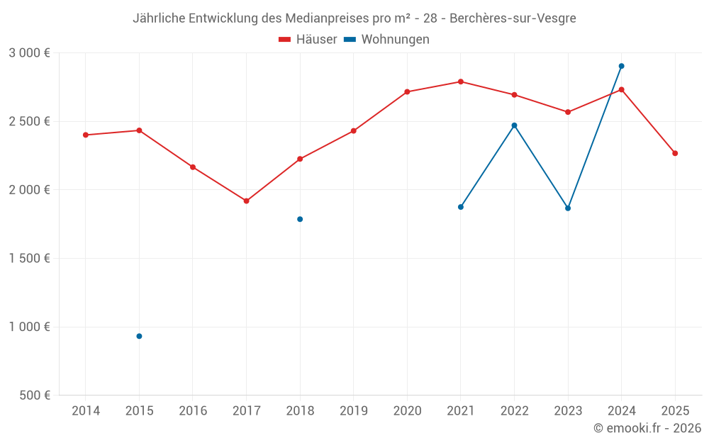 Der Durchschnittspreis auf den 14 Hausgeschäften der letzten 24 Monate in der Gemeinde Berchères-sur-Vesgre betrug 2 643 € pro Quadratmeter für einen mittleren Immobilienwert von 246 975 €. Über diesen Zeitraum hinweg lagen 60% der Transaktionen zwischen 2 276 und 3 533 € pro Quadratmeter (vom 2. bis zum 8. Dezil).