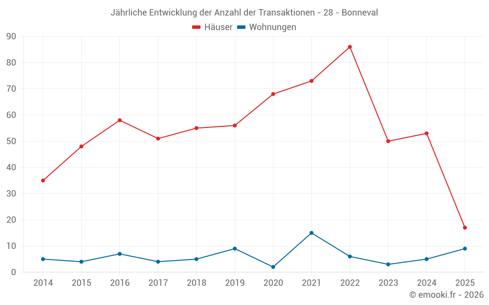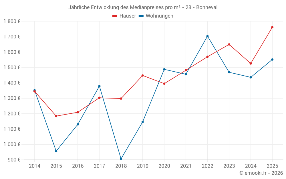 Der Durchschnittspreis auf den 17 Wohnungstransaktionen der letzten 24 Monate in der Gemeinde Bonneval betrug 1 469 € pro Quadratmeter für einen mittleren Immobilienwert von 110 000 €. Über diesen Zeitraum hinweg lagen 60% der Transaktionen zwischen 1 094 und 1 952 € pro Quadratmeter (vom 2. bis zum 8. Dezil).