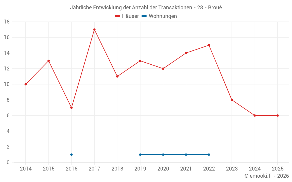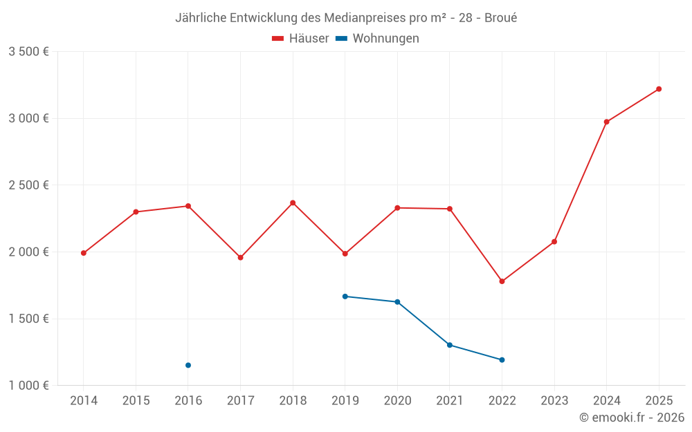 Der Durchschnittspreis auf den 16 Hausgeschäften der letzten 24 Monate in der Gemeinde Broué betrug 2 917 € pro Quadratmeter für einen mittleren Immobilienwert von 269 250 €. Über diesen Zeitraum hinweg lagen 60% der Transaktionen zwischen 1 700 und 3 333 € pro Quadratmeter (vom 2. bis zum 8. Dezil).