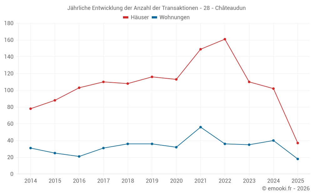 Der Durchschnittspreis auf den 37 Hausgeschäften der letzten 6 Monate in der Gemeinde Châteaudun betrug 1 175 € pro Quadratmeter für einen mittleren Immobilienwert von 91 595 €. Über diesen Zeitraum hinweg lagen 60% der Transaktionen zwischen 920 und 1 618 € pro Quadratmeter (vom 2. bis zum 8. Dezil).