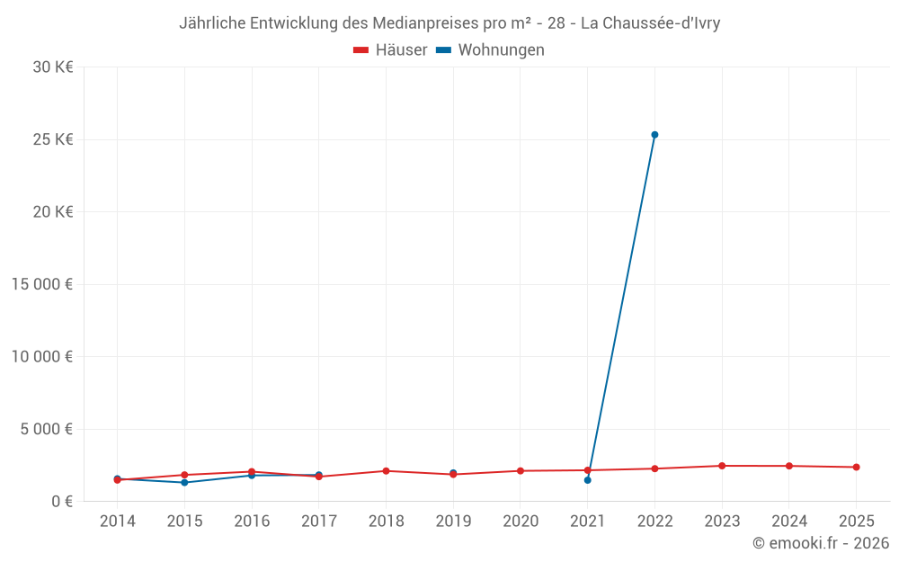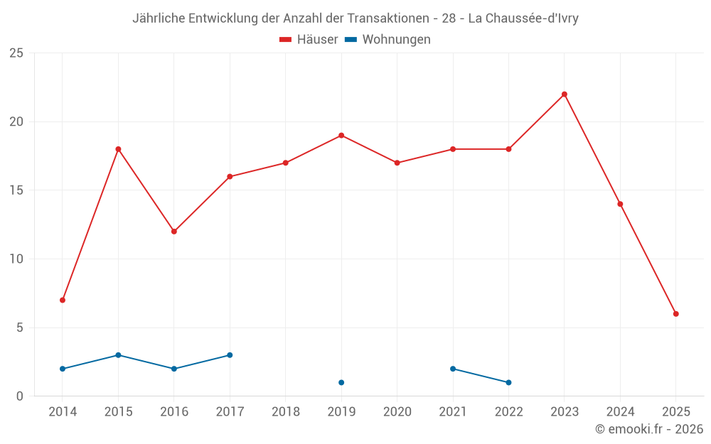 Der Durchschnittspreis auf den 32 Hausgeschäften der letzten 24 Monate in der Gemeinde La Chaussée-d'Ivry betrug 2 460 € pro Quadratmeter für einen mittleren Immobilienwert von 200 000 €. Über diesen Zeitraum hinweg lagen 60% der Transaktionen zwischen 1 955 und 2 964 € pro Quadratmeter (vom 2. bis zum 8. Dezil).