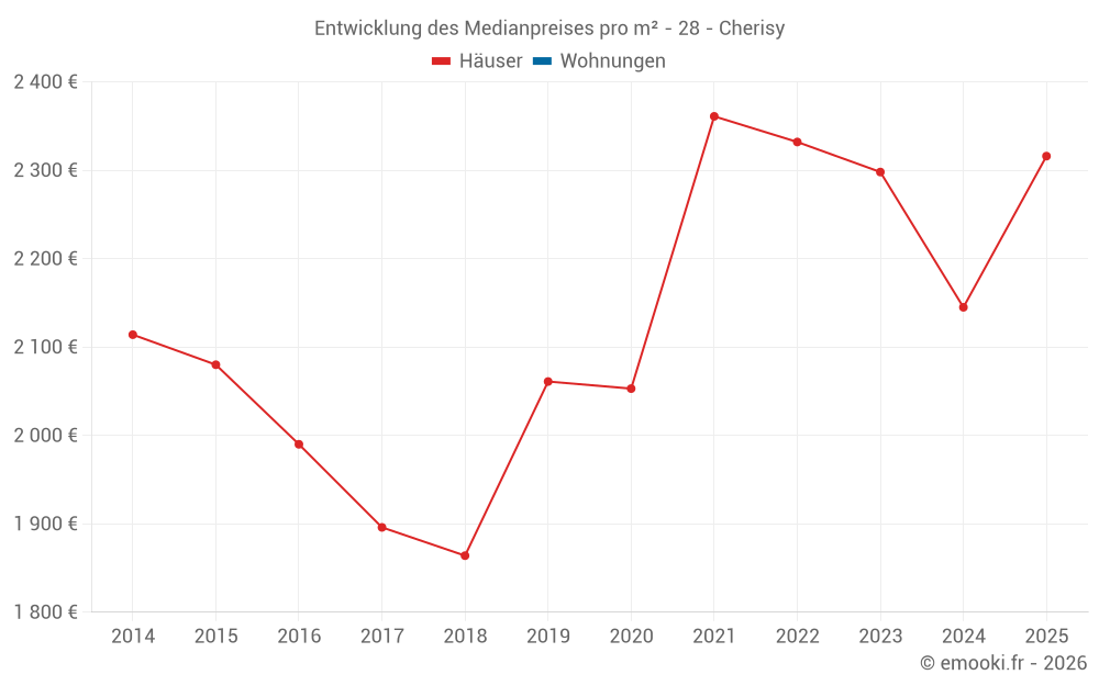 Der Durchschnittspreis auf den 19 Hausgeschäften der letzten 12 Monate in der Gemeinde Cherisy betrug 2 283 € pro Quadratmeter für einen mittleren Immobilienwert von 210 000 €. Über diesen Zeitraum hinweg lagen 60% der Transaktionen zwischen 2 084 und 2 667 € pro Quadratmeter (vom 2. bis zum 8. Dezil).