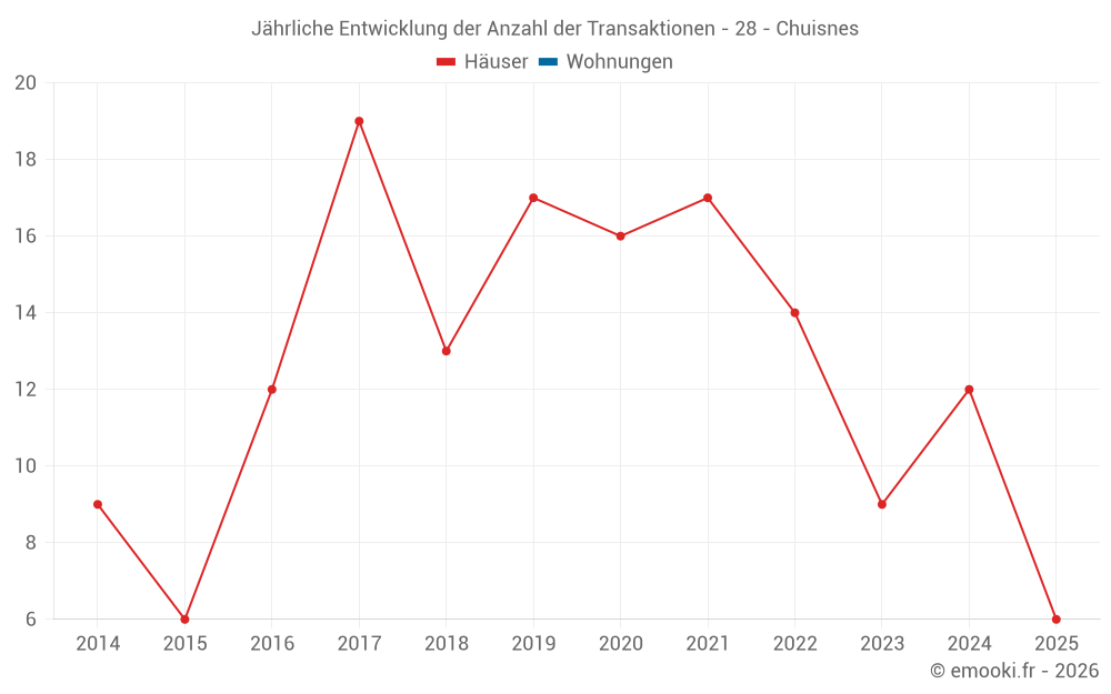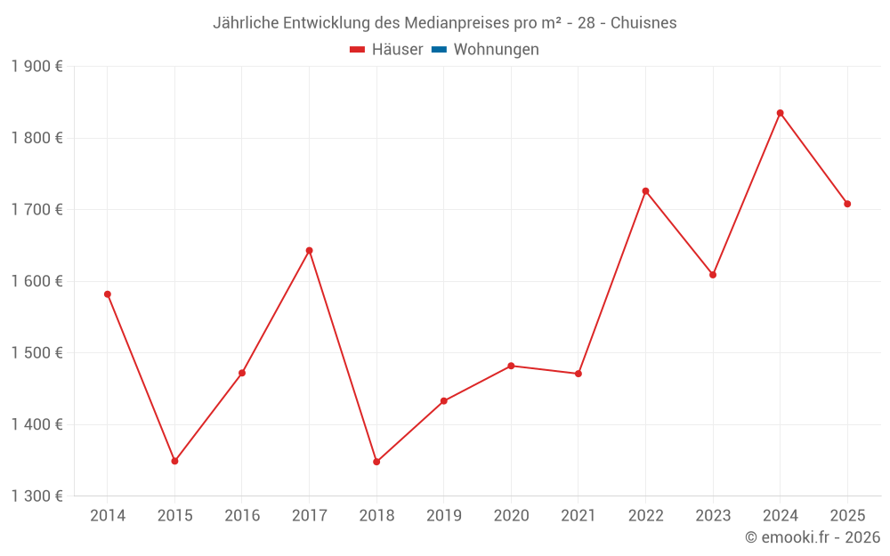 Der Durchschnittspreis auf den 24 Hausgeschäften der letzten 24 Monate in der Gemeinde Chuisnes betrug 1 735 € pro Quadratmeter für einen mittleren Immobilienwert von 170 000 €. Über diesen Zeitraum hinweg lagen 60% der Transaktionen zwischen 1 464 und 1 993 € pro Quadratmeter (vom 2. bis zum 8. Dezil).