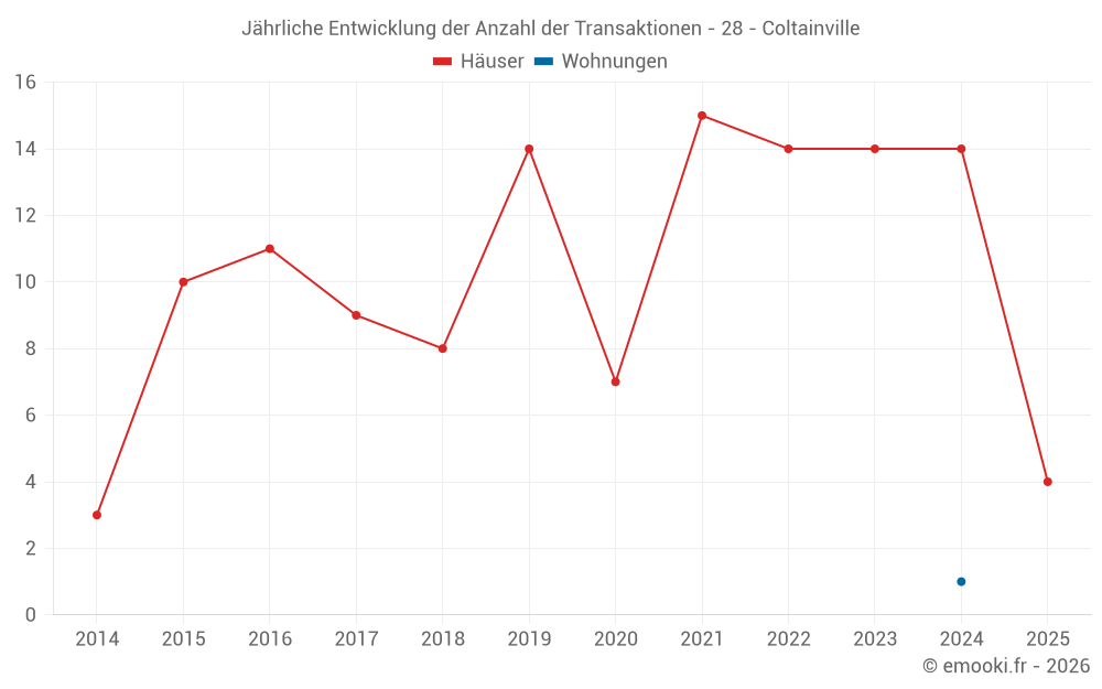 Der Durchschnittspreis auf den 27 Hausgeschäften der letzten 24 Monate in der Gemeinde Coltainville betrug 2 055 € pro Quadratmeter für einen mittleren Immobilienwert von 215 000 €. Über diesen Zeitraum hinweg lagen 60% der Transaktionen zwischen 1 699 und 2 594 € pro Quadratmeter (vom 2. bis zum 8. Dezil).