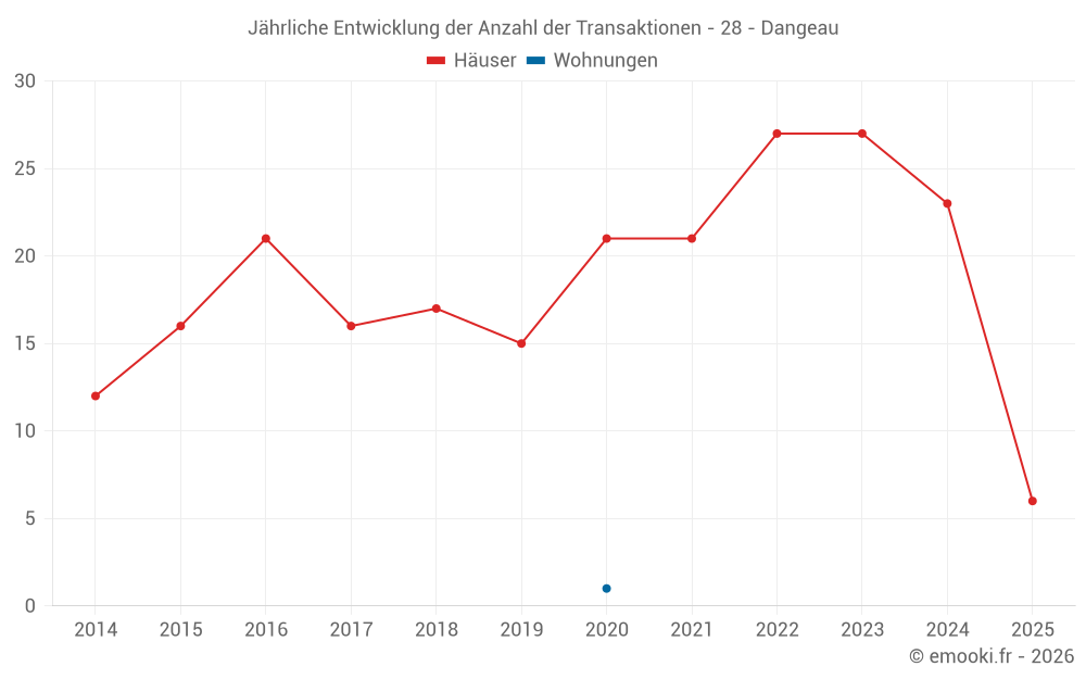 Der Durchschnittspreis auf den 44 Hausgeschäften der letzten 24 Monate in der Gemeinde Dangeau betrug 1 490 € pro Quadratmeter für einen mittleren Immobilienwert von 112 075 €. Über diesen Zeitraum hinweg lagen 60% der Transaktionen zwischen 886 und 1 878 € pro Quadratmeter (vom 2. bis zum 8. Dezil).