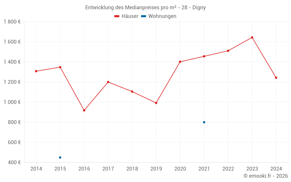 Der Durchschnittspreis auf den 19 Hausgeschäften der letzten 24 Monate in der Gemeinde Digny betrug 1 287 € pro Quadratmeter für einen mittleren Immobilienwert von 148 000 €. Über diesen Zeitraum hinweg lagen 60% der Transaktionen zwischen 924 und 1 782 € pro Quadratmeter (vom 2. bis zum 8. Dezil).