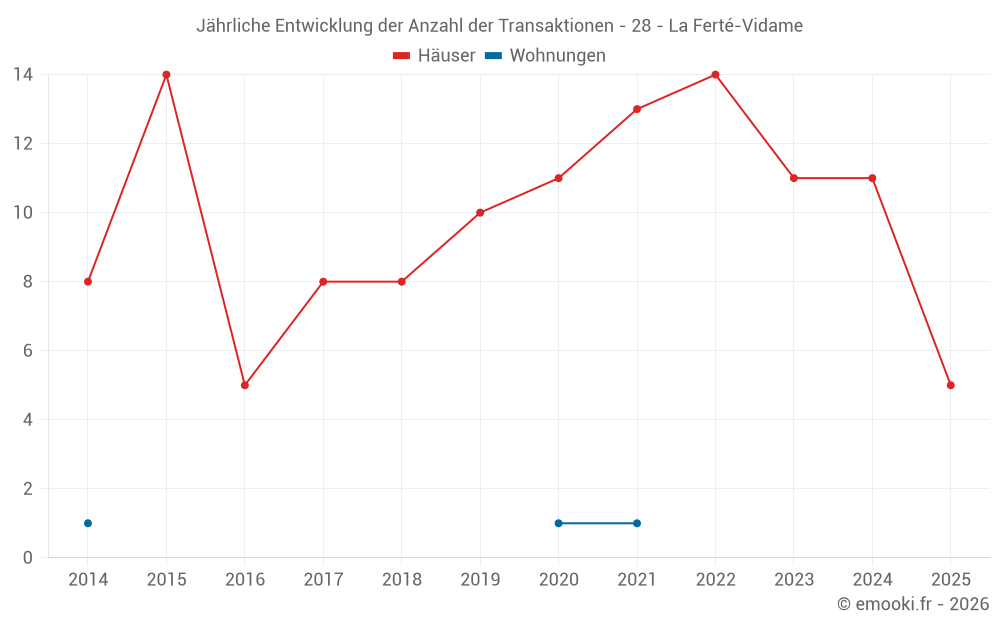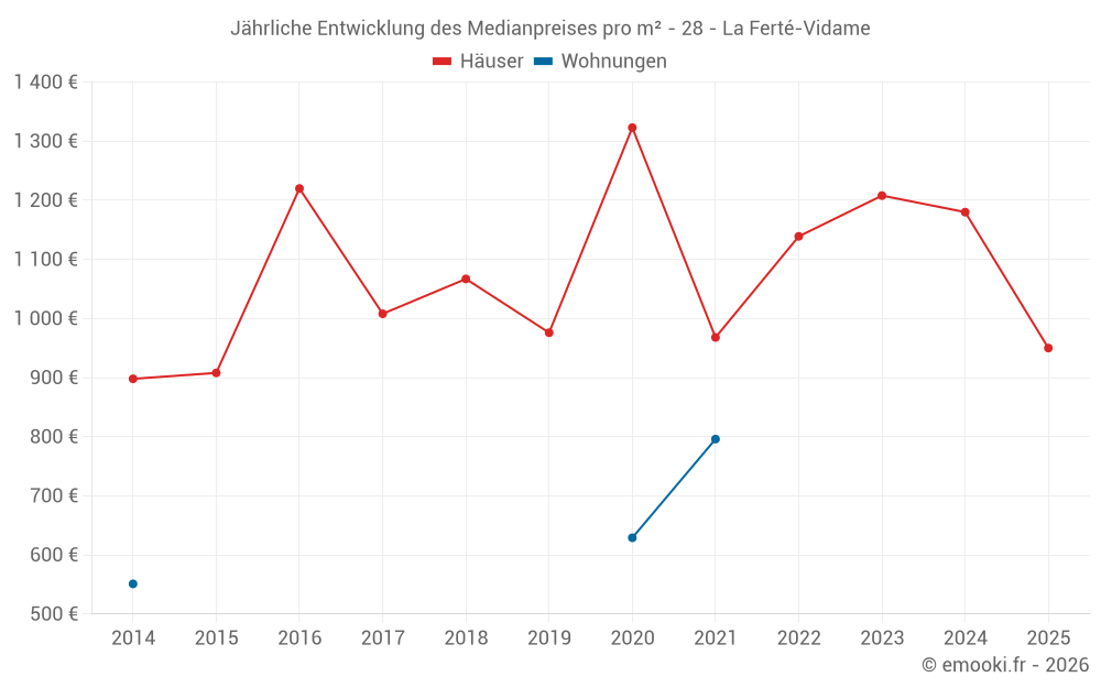 Der Durchschnittspreis auf den 22 Hausgeschäften der letzten 24 Monate in der Gemeinde La Ferté-Vidame betrug 1 168 € pro Quadratmeter für einen mittleren Immobilienwert von 102 900 €. Über diesen Zeitraum hinweg lagen 60% der Transaktionen zwischen 841 und 1 436 € pro Quadratmeter (vom 2. bis zum 8. Dezil).