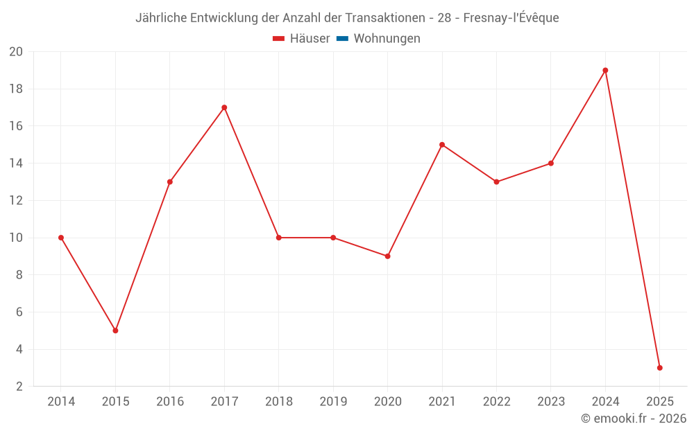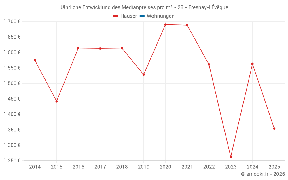 Der Durchschnittspreis auf den 30 Hausgeschäften der letzten 24 Monate in der Gemeinde Fresnay-l'Évêque betrug 1 540 € pro Quadratmeter für einen mittleren Immobilienwert von 145 500 €. Über diesen Zeitraum hinweg lagen 60% der Transaktionen zwischen 1 034 und 2 074 € pro Quadratmeter (vom 2. bis zum 8. Dezil).