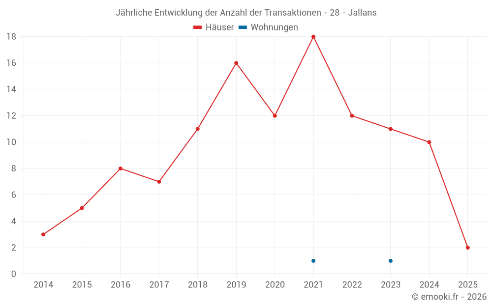 Der Durchschnittspreis auf den 17 Hausgeschäften der letzten 24 Monate in der Gemeinde Jallans betrug 1 360 € pro Quadratmeter für einen mittleren Immobilienwert von 138 000 €. Über diesen Zeitraum hinweg lagen 60% der Transaktionen zwischen 1 160 und 1 641 € pro Quadratmeter (vom 2. bis zum 8. Dezil).