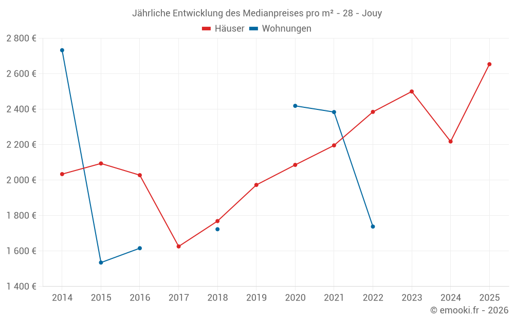 Der Durchschnittspreis auf den 19 Hausgeschäften der letzten 12 Monate in der Gemeinde Jouy betrug 2 551 € pro Quadratmeter für einen mittleren Immobilienwert von 228 500 €. Über diesen Zeitraum hinweg lagen 60% der Transaktionen zwischen 1 887 und 3 061 € pro Quadratmeter (vom 2. bis zum 8. Dezil).