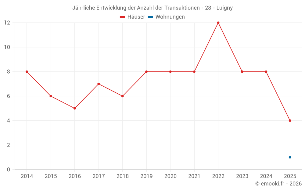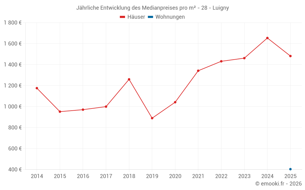 Der Durchschnittspreis auf den 15 Hausgeschäften der letzten 24 Monate in der Gemeinde Luigny betrug 1 512 € pro Quadratmeter für einen mittleren Immobilienwert von 112 000 €. Über diesen Zeitraum hinweg lagen 60% der Transaktionen zwischen 1 111 und 2 343 € pro Quadratmeter (vom 2. bis zum 8. Dezil).
