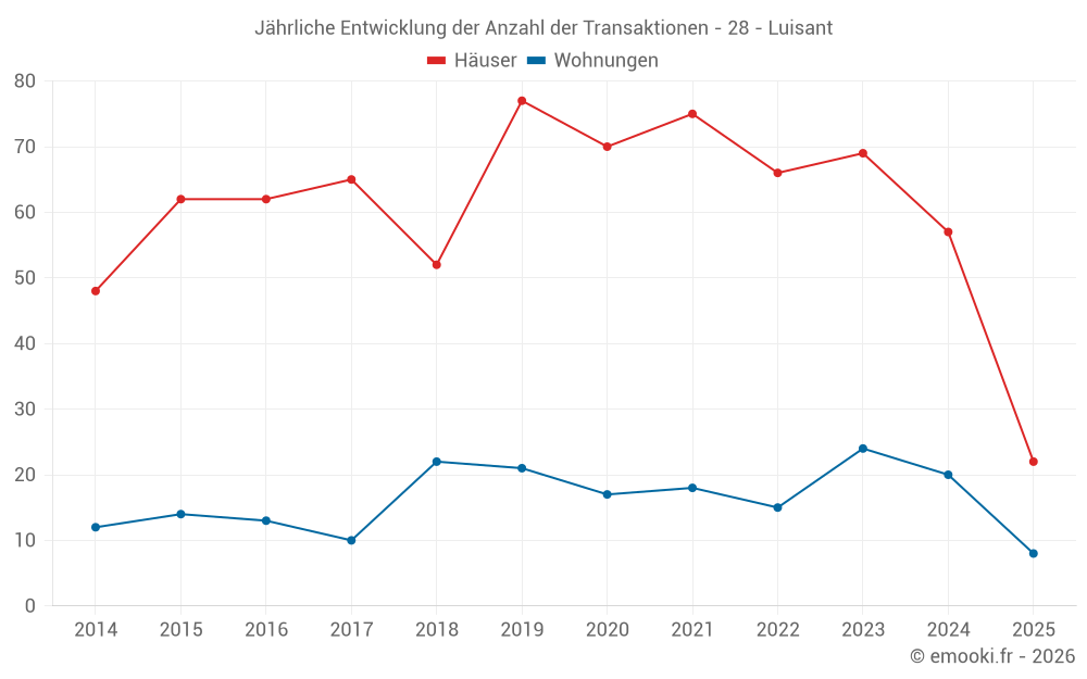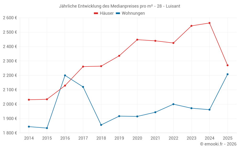 Der Durchschnittspreis auf den 22 Hausgeschäften der letzten 6 Monate in der Gemeinde Luisant betrug 2 270 € pro Quadratmeter für einen mittleren Immobilienwert von 234 845 €. Über diesen Zeitraum hinweg lagen 60% der Transaktionen zwischen 1 774 und 2 707 € pro Quadratmeter (vom 2. bis zum 8. Dezil).
