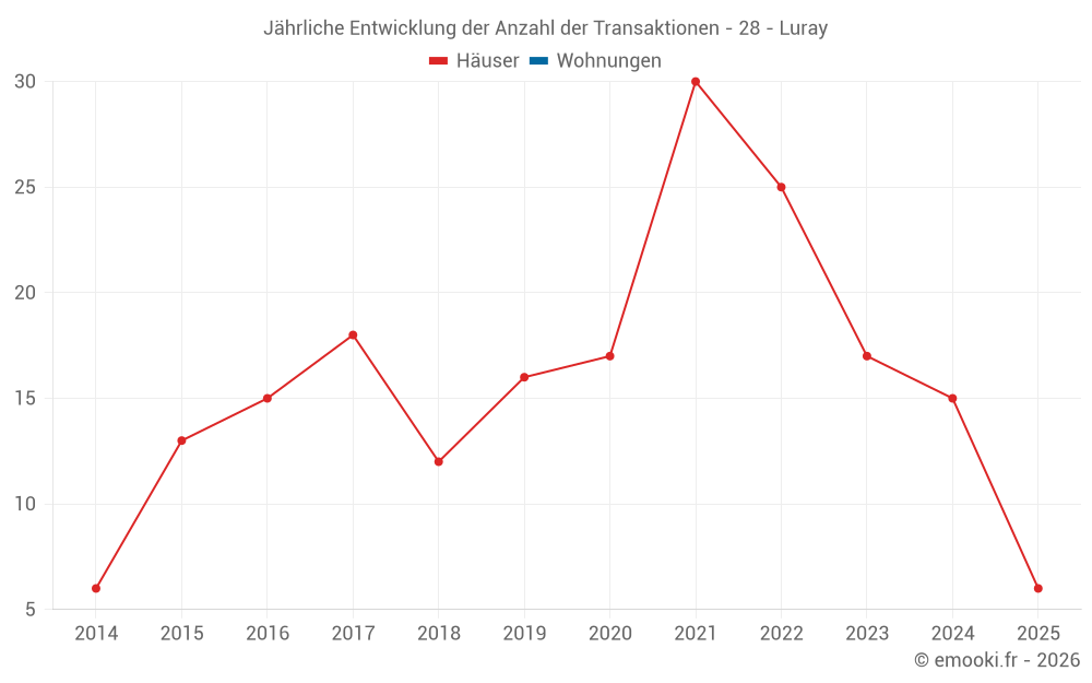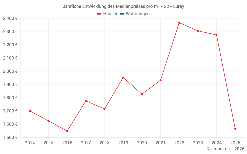 Der Durchschnittspreis auf den 31 Hausgeschäften der letzten 24 Monate in der Gemeinde Luray betrug 2 239 € pro Quadratmeter für einen mittleren Immobilienwert von 199 000 €. Über diesen Zeitraum hinweg lagen 60% der Transaktionen zwischen 1 776 und 2 683 € pro Quadratmeter (vom 2. bis zum 8. Dezil).
