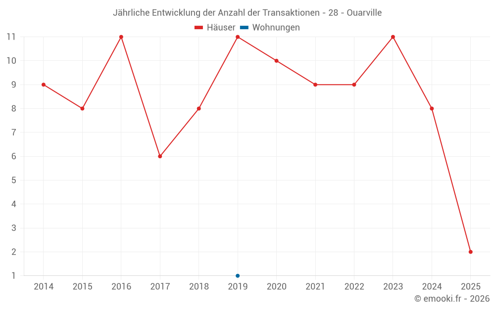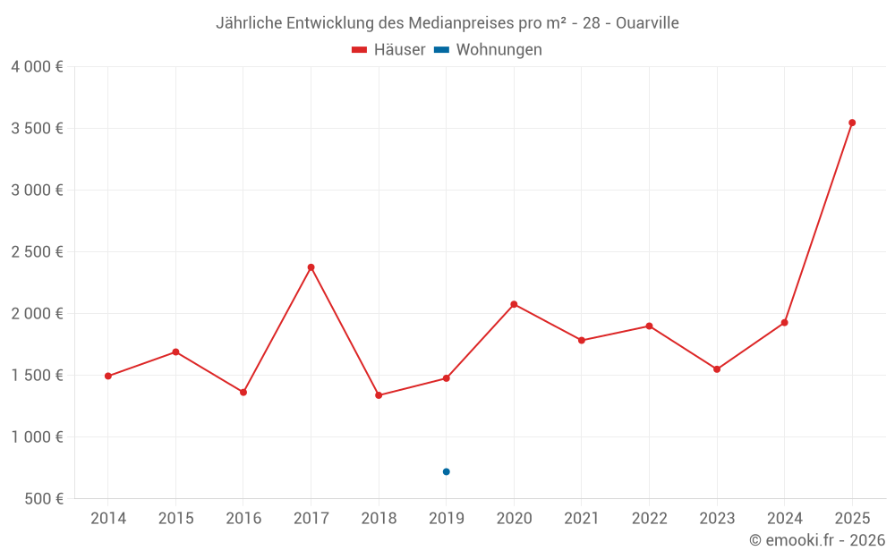 Der Durchschnittspreis auf den 15 Hausgeschäften der letzten 24 Monate in der Gemeinde Ouarville betrug 1 855 € pro Quadratmeter für einen mittleren Immobilienwert von 169 000 €. Über diesen Zeitraum hinweg lagen 60% der Transaktionen zwischen 1 371 und 2 573 € pro Quadratmeter (vom 2. bis zum 8. Dezil).