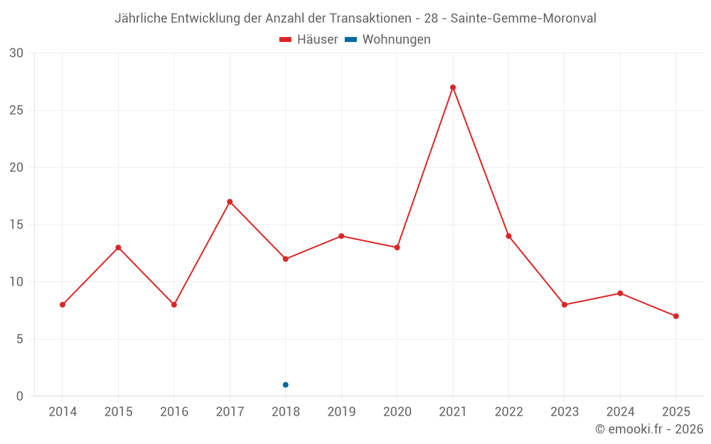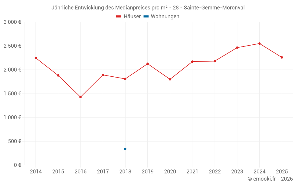 Der Durchschnittspreis auf den 21 Hausgeschäften der letzten 24 Monate in der Gemeinde Sainte-Gemme-Moronval betrug 2 500 € pro Quadratmeter für einen mittleren Immobilienwert von 230 000 €. Über diesen Zeitraum hinweg lagen 60% der Transaktionen zwischen 1 896 und 2 767 € pro Quadratmeter (vom 2. bis zum 8. Dezil).