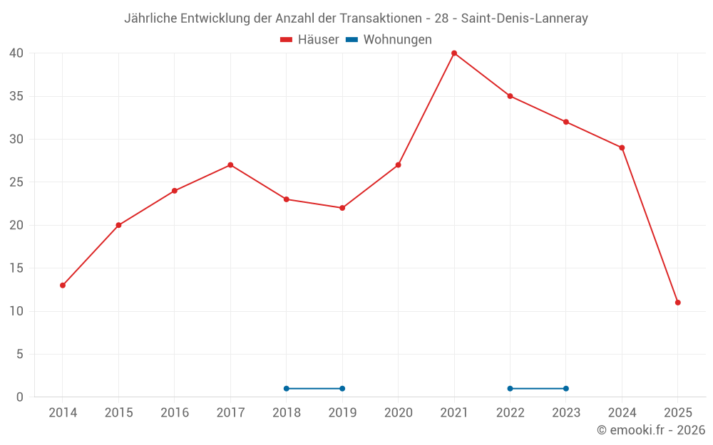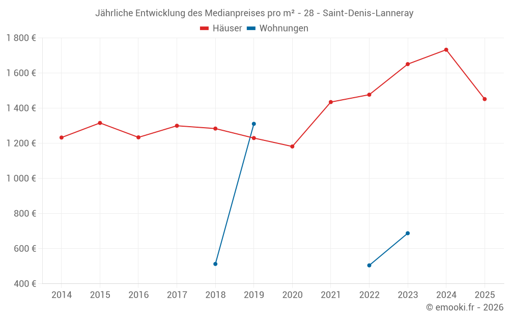 Der Durchschnittspreis auf den 29 Hausgeschäften der letzten 12 Monate in der Gemeinde Saint-Denis-Lanneray betrug 1 523 € pro Quadratmeter für einen mittleren Immobilienwert von 133 300 €. Über diesen Zeitraum hinweg lagen 60% der Transaktionen zwischen 1 114 und 1 909 € pro Quadratmeter (vom 2. bis zum 8. Dezil).