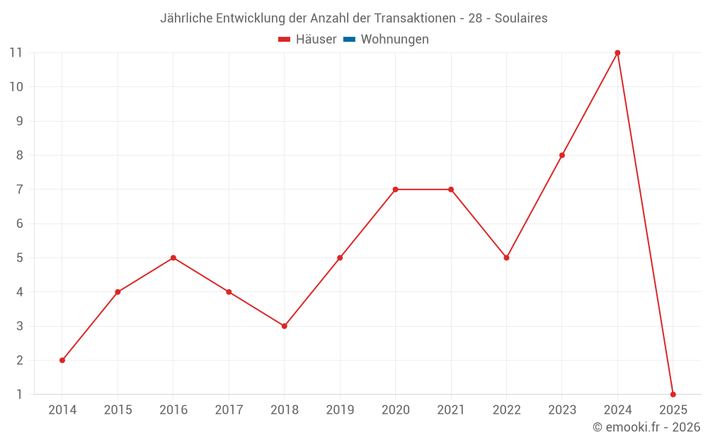 Der Durchschnittspreis auf den 16 Hausgeschäften der letzten 24 Monate in der Gemeinde Soulaires betrug 2 256 € pro Quadratmeter für einen mittleren Immobilienwert von 221 000 €. Über diesen Zeitraum hinweg lagen 60% der Transaktionen zwischen 1 679 und 2 679 € pro Quadratmeter (vom 2. bis zum 8. Dezil).