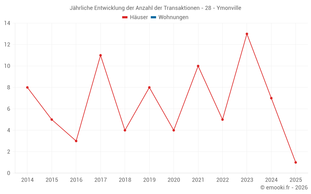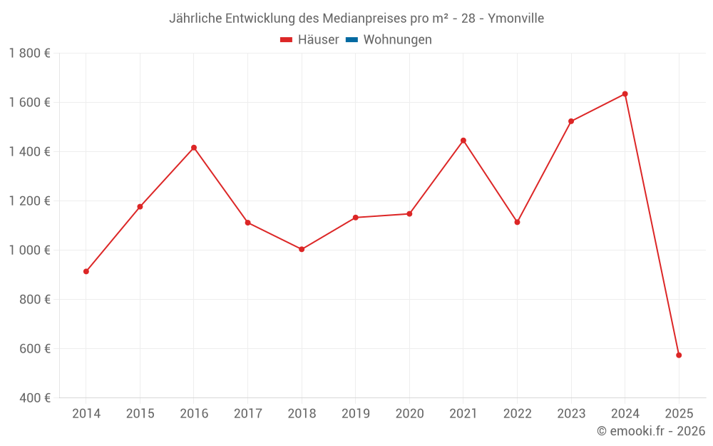 Der Durchschnittspreis auf den 16 Hausgeschäften der letzten 24 Monate in der Gemeinde Ymonville betrug 1 488 € pro Quadratmeter für einen mittleren Immobilienwert von 122 500 €. Über diesen Zeitraum hinweg lagen 60% der Transaktionen zwischen 1 040 und 1 863 € pro Quadratmeter (vom 2. bis zum 8. Dezil).