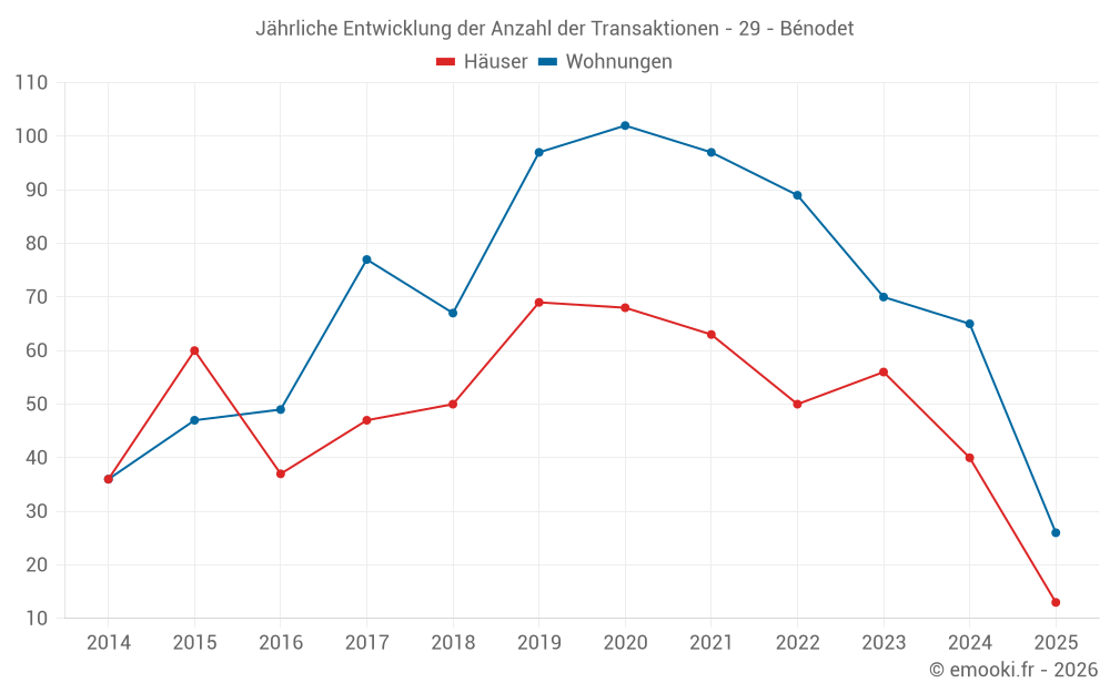 Der Durchschnittspreis auf den 26 Wohnungstransaktionen der letzten 6 Monate in der Gemeinde Bénodet betrug 4 097 € pro Quadratmeter für einen mittleren Immobilienwert von 147 995 €. Über diesen Zeitraum hinweg lagen 60% der Transaktionen zwischen 3 045 und 4 833 € pro Quadratmeter (vom 2. bis zum 8. Dezil).