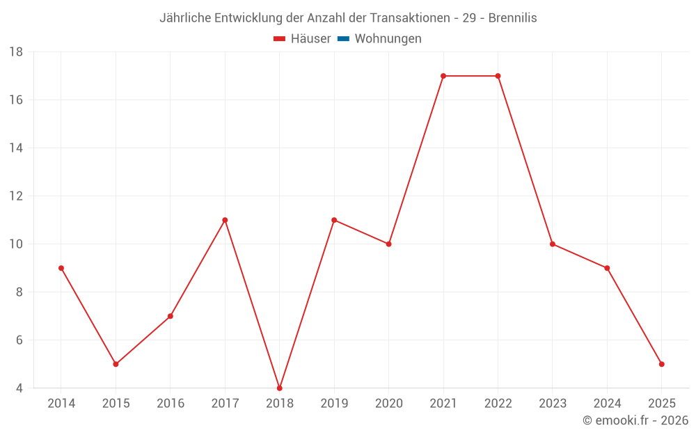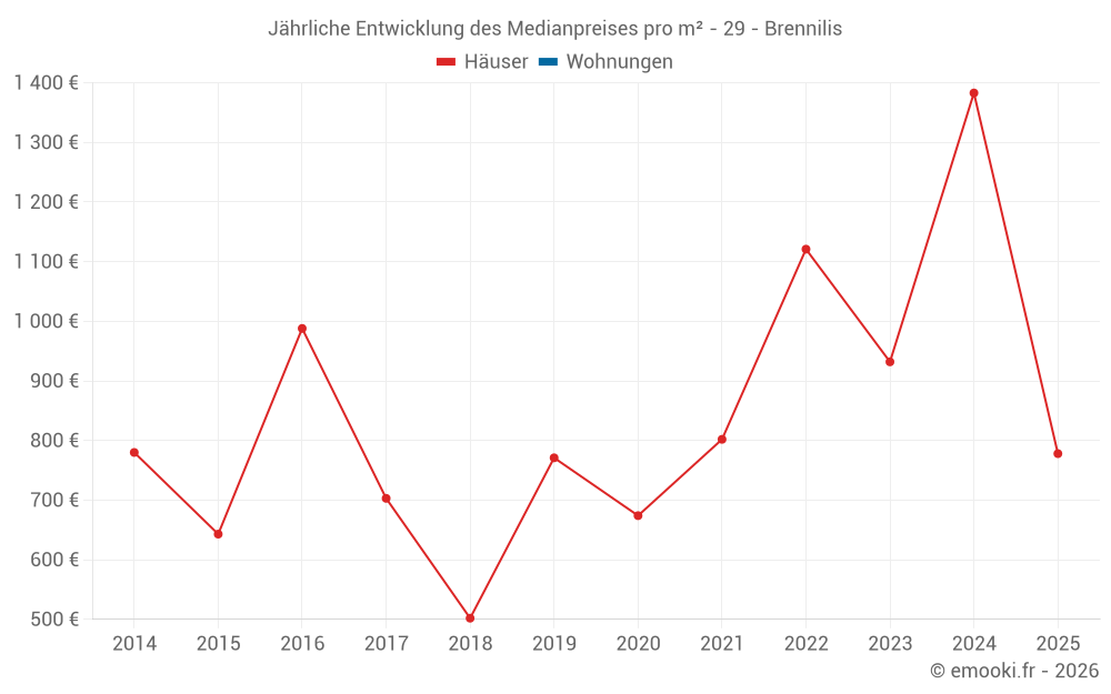 Der Durchschnittspreis auf den 20 Hausgeschäften der letzten 24 Monate in der Gemeinde Brennilis betrug 1 017 € pro Quadratmeter für einen mittleren Immobilienwert von 70 000 €. Über diesen Zeitraum hinweg lagen 60% der Transaktionen zwischen 648 und 1 630 € pro Quadratmeter (vom 2. bis zum 8. Dezil).