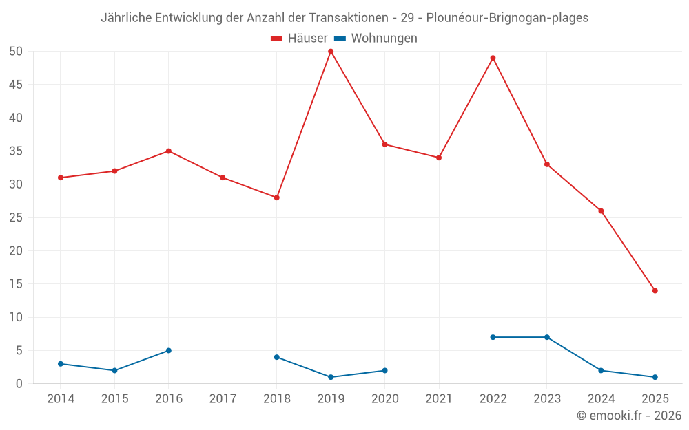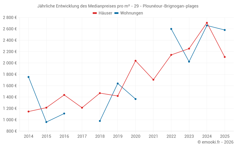 Der Durchschnittspreis auf den 28 Hausgeschäften der letzten 12 Monate in der Gemeinde Plounéour-Brignogan-plages betrug 1 988 € pro Quadratmeter für einen mittleren Immobilienwert von 192 500 €. Über diesen Zeitraum hinweg lagen 60% der Transaktionen zwischen 1 507 und 2 778 € pro Quadratmeter (vom 2. bis zum 8. Dezil).