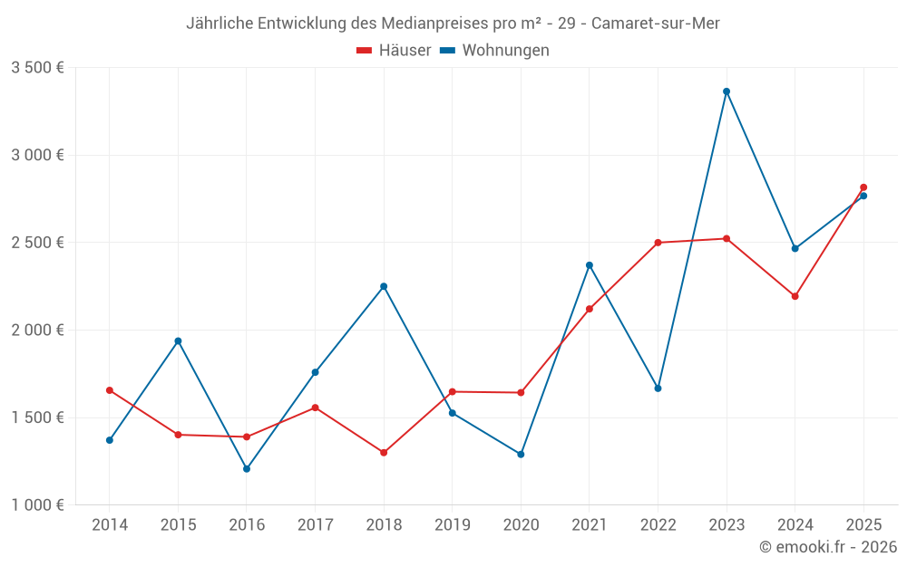 Der Durchschnittspreis auf den 15 Wohnungstransaktionen der letzten 24 Monate in der Gemeinde Camaret-sur-Mer betrug 2 500 € pro Quadratmeter für einen mittleren Immobilienwert von 145 000 €. Über diesen Zeitraum hinweg lagen 60% der Transaktionen zwischen 2 231 und 4 718 € pro Quadratmeter (vom 2. bis zum 8. Dezil).