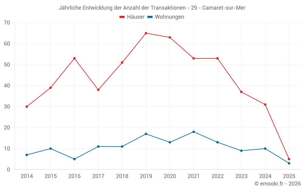Der Durchschnittspreis auf den 25 Hausgeschäften der letzten 12 Monate in der Gemeinde Camaret-sur-Mer betrug 2 769 € pro Quadratmeter für einen mittleren Immobilienwert von 220 000 €. Über diesen Zeitraum hinweg lagen 60% der Transaktionen zwischen 1 923 und 3 138 € pro Quadratmeter (vom 2. bis zum 8. Dezil).