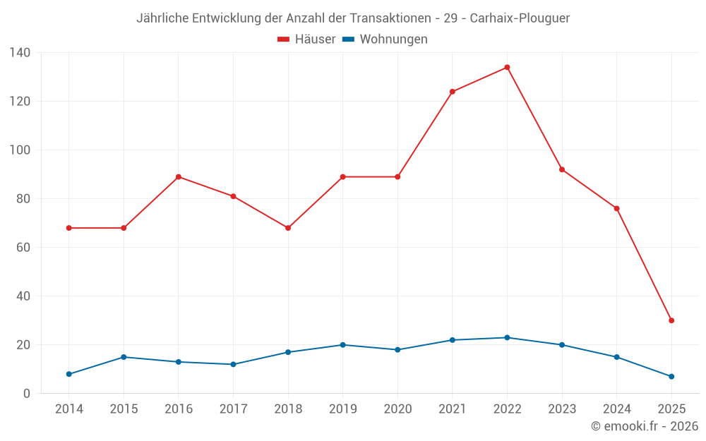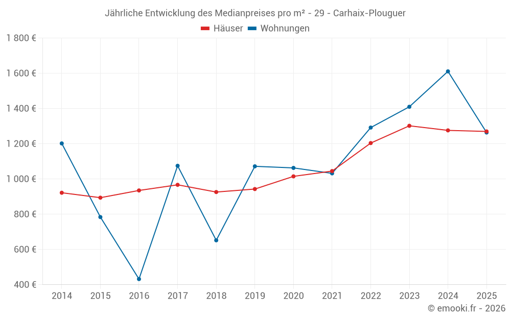 Der Durchschnittspreis auf den 28 Wohnungstransaktionen der letzten 24 Monate in der Gemeinde Carhaix-Plouguer betrug 1 429 € pro Quadratmeter für einen mittleren Immobilienwert von 79 500 €. Über diesen Zeitraum hinweg lagen 60% der Transaktionen zwischen 1 019 und 1 812 € pro Quadratmeter (vom 2. bis zum 8. Dezil).