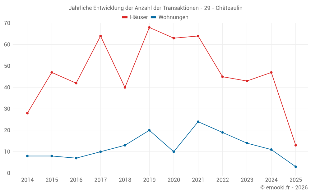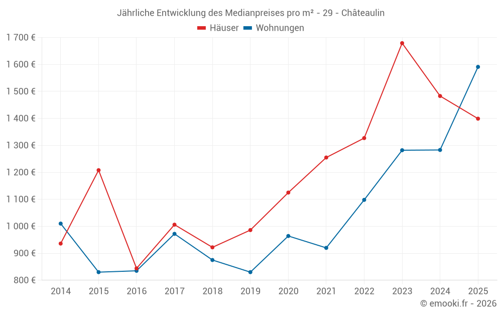 Der Durchschnittspreis auf den 38 Hausgeschäften der letzten 12 Monate in der Gemeinde Châteaulin betrug 1 402 € pro Quadratmeter für einen mittleren Immobilienwert von 117 660 €. Über diesen Zeitraum hinweg lagen 60% der Transaktionen zwischen 863 und 1 854 € pro Quadratmeter (vom 2. bis zum 8. Dezil).