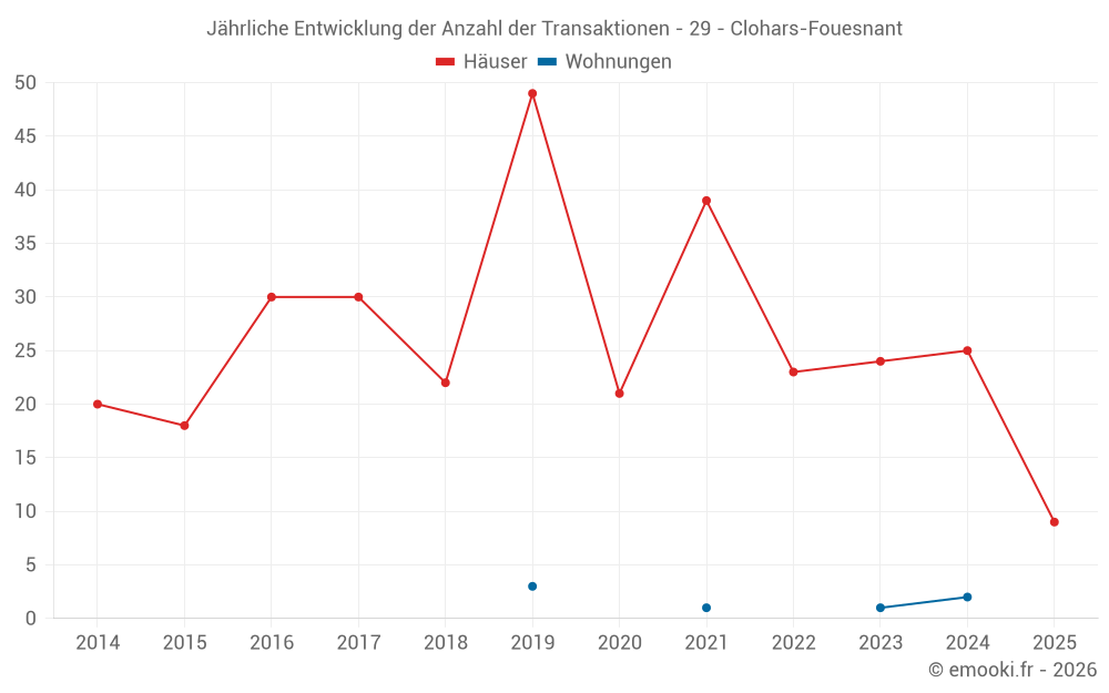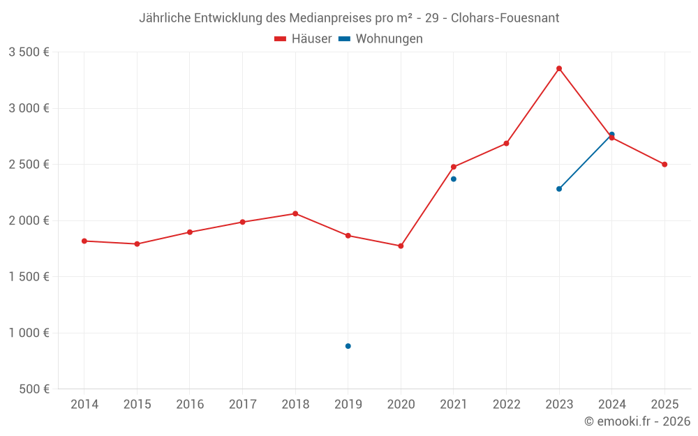 Der Durchschnittspreis auf den 26 Hausgeschäften der letzten 12 Monate in der Gemeinde Clohars-Fouesnant betrug 2 624 € pro Quadratmeter für einen mittleren Immobilienwert von 257 500 €. Über diesen Zeitraum hinweg lagen 60% der Transaktionen zwischen 2 011 und 3 021 € pro Quadratmeter (vom 2. bis zum 8. Dezil).