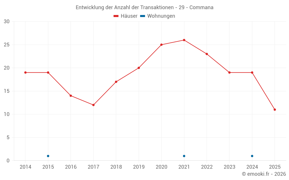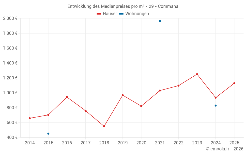 Der Durchschnittspreis auf den 18 Hausgeschäften der letzten 12 Monate in der Gemeinde Commana betrug 1 117 € pro Quadratmeter für einen mittleren Immobilienwert von 80 500 €. Über diesen Zeitraum hinweg lagen 60% der Transaktionen zwischen 471 und 1 527 € pro Quadratmeter (vom 2. bis zum 8. Dezil).