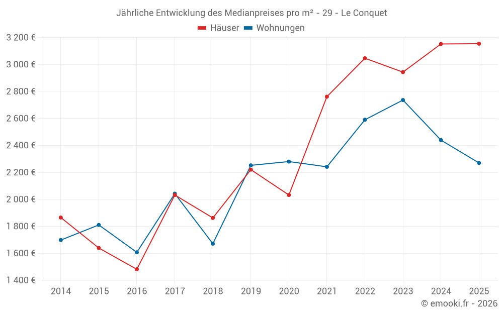 Der Durchschnittspreis auf den 16 Wohnungstransaktionen der letzten 24 Monate in der Gemeinde Le Conquet betrug 2 518 € pro Quadratmeter für einen mittleren Immobilienwert von 154 500 €. Über diesen Zeitraum hinweg lagen 60% der Transaktionen zwischen 1 854 und 3 171 € pro Quadratmeter (vom 2. bis zum 8. Dezil).