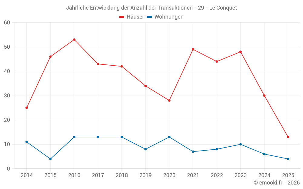 Der Durchschnittspreis auf den 33 Hausgeschäften der letzten 12 Monate in der Gemeinde Le Conquet betrug 2 857 € pro Quadratmeter für einen mittleren Immobilienwert von 345 000 €. Über diesen Zeitraum hinweg lagen 60% der Transaktionen zwischen 2 179 und 3 697 € pro Quadratmeter (vom 2. bis zum 8. Dezil).