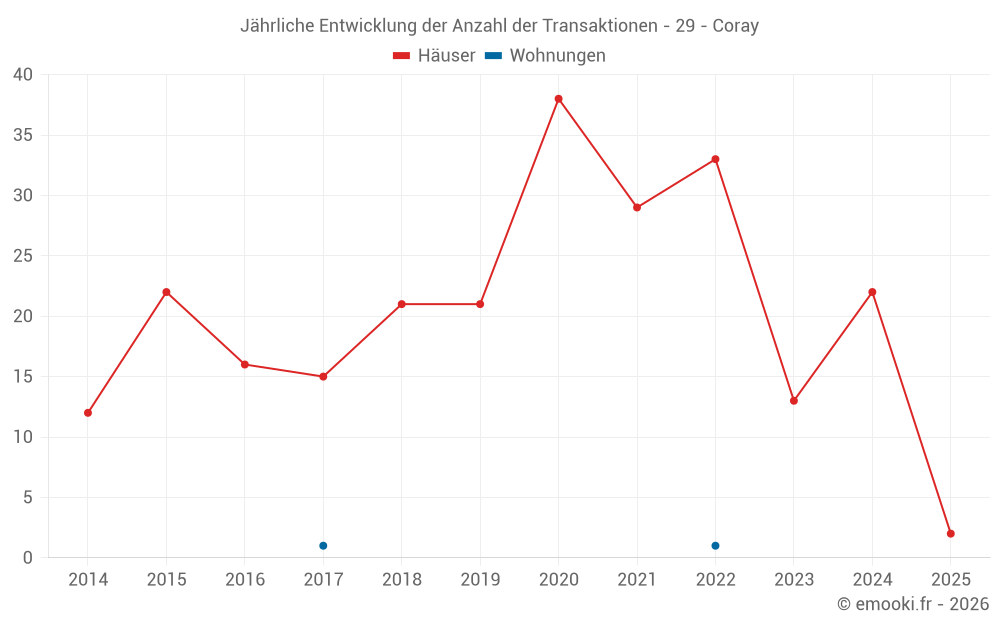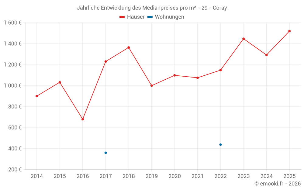 Der Durchschnittspreis auf den 30 Hausgeschäften der letzten 24 Monate in der Gemeinde Coray betrug 1 316 € pro Quadratmeter für einen mittleren Immobilienwert von 141 500 €. Über diesen Zeitraum hinweg lagen 60% der Transaktionen zwischen 804 und 1 645 € pro Quadratmeter (vom 2. bis zum 8. Dezil).