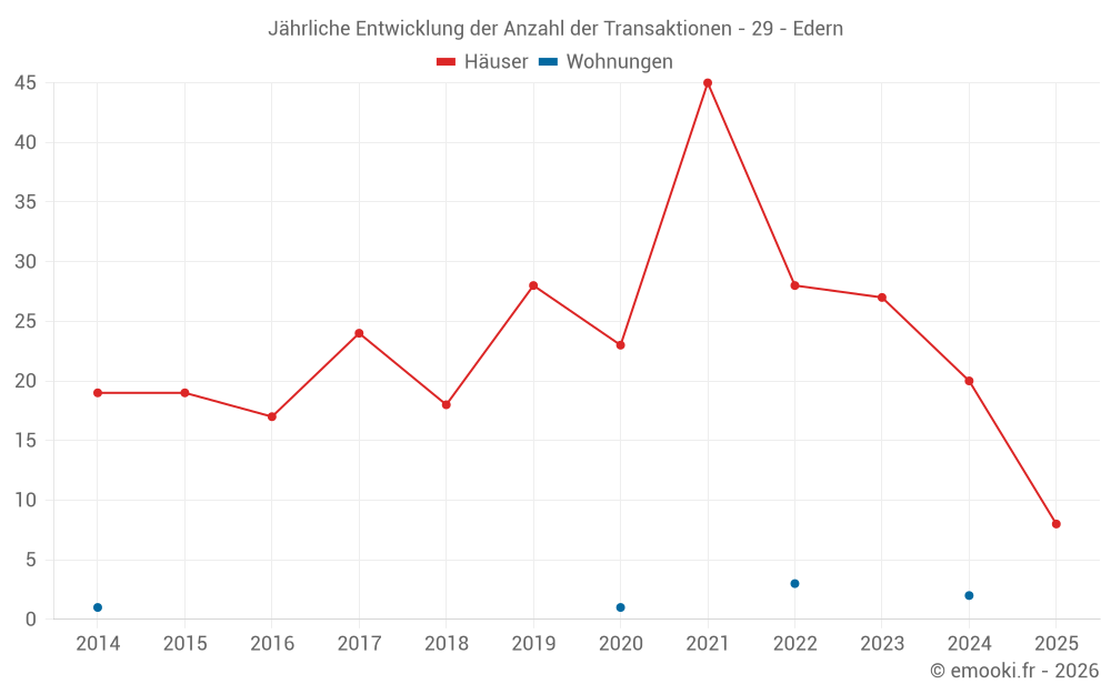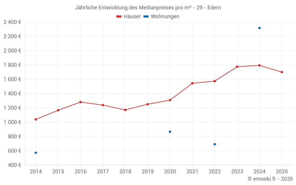 Der Durchschnittspreis auf den 21 Hausgeschäften der letzten 12 Monate in der Gemeinde Edern betrug 1 984 € pro Quadratmeter für einen mittleren Immobilienwert von 185 000 €. Über diesen Zeitraum hinweg lagen 60% der Transaktionen zwischen 1 429 und 2 473 € pro Quadratmeter (vom 2. bis zum 8. Dezil).