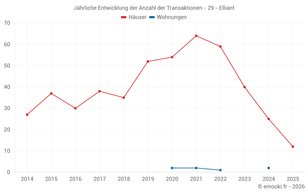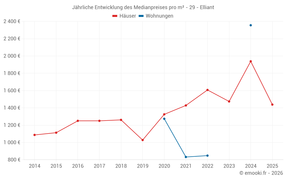 Der Durchschnittspreis auf den 26 Hausgeschäften der letzten 12 Monate in der Gemeinde Elliant betrug 1 760 € pro Quadratmeter für einen mittleren Immobilienwert von 175 000 €. Über diesen Zeitraum hinweg lagen 60% der Transaktionen zwischen 1 143 und 2 478 € pro Quadratmeter (vom 2. bis zum 8. Dezil).