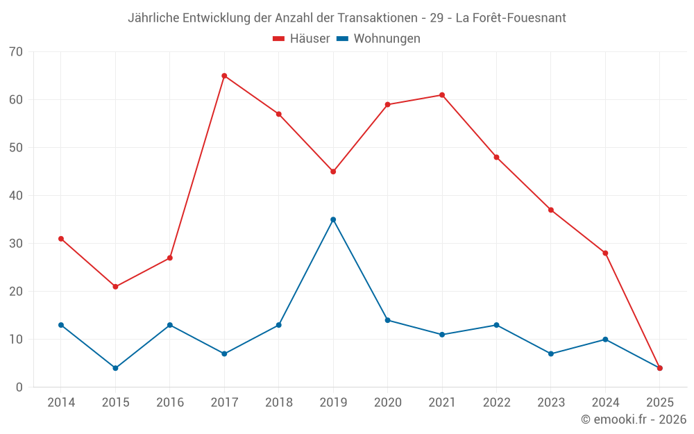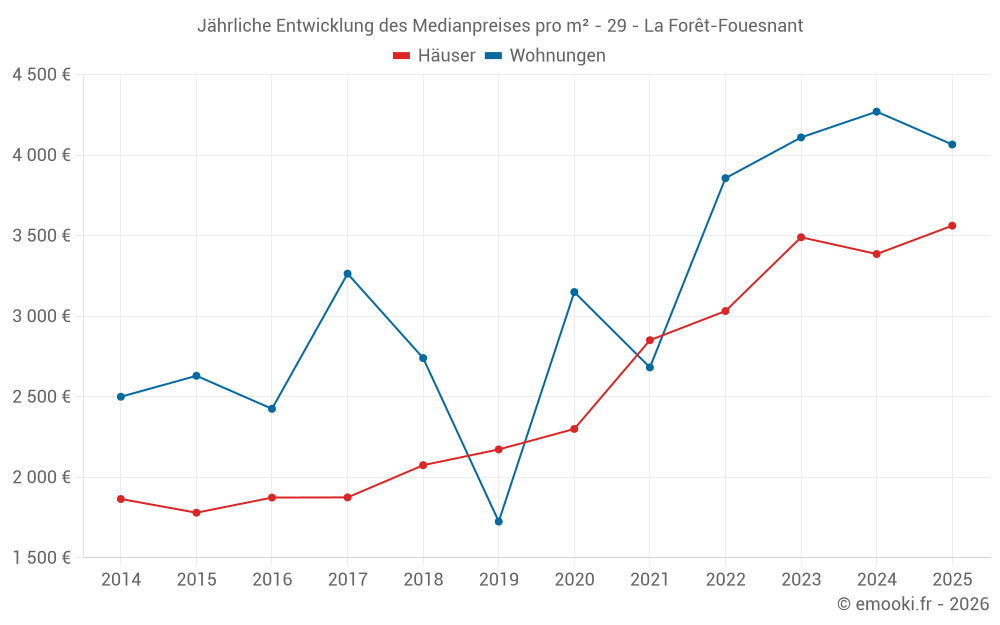 Der Durchschnittspreis auf den 19 Wohnungstransaktionen der letzten 24 Monate in der Gemeinde La Forêt-Fouesnant betrug 4 087 € pro Quadratmeter für einen mittleren Immobilienwert von 190 000 €. Über diesen Zeitraum hinweg lagen 60% der Transaktionen zwischen 3 033 und 4 494 € pro Quadratmeter (vom 2. bis zum 8. Dezil).