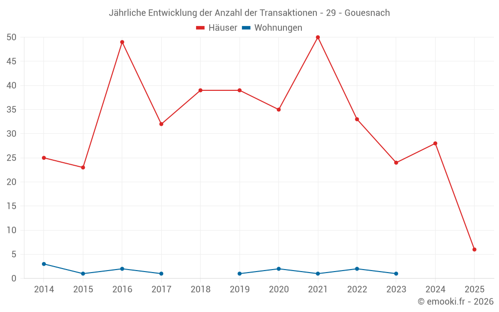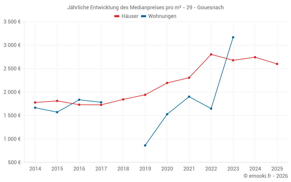 Der Durchschnittspreis auf den 19 Hausgeschäften der letzten 12 Monate in der Gemeinde Gouesnach betrug 2 933 € pro Quadratmeter für einen mittleren Immobilienwert von 283 500 €. Über diesen Zeitraum hinweg lagen 60% der Transaktionen zwischen 1 873 und 3 508 € pro Quadratmeter (vom 2. bis zum 8. Dezil).