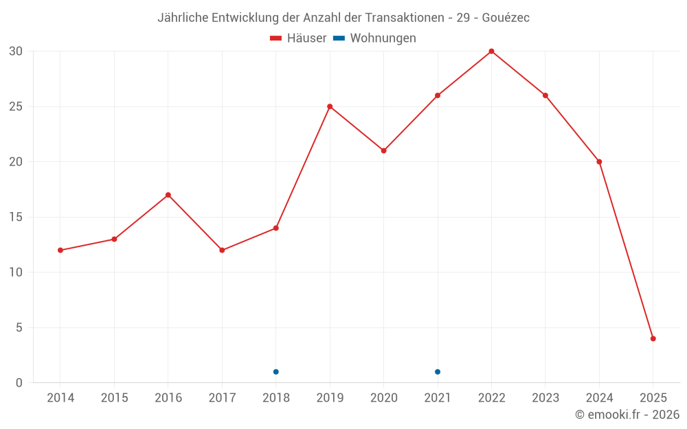 Der Durchschnittspreis auf den 42 Hausgeschäften der letzten 24 Monate in der Gemeinde Gouézec betrug 1 528 € pro Quadratmeter für einen mittleren Immobilienwert von 137 000 €. Über diesen Zeitraum hinweg lagen 60% der Transaktionen zwischen 1 080 und 2 225 € pro Quadratmeter (vom 2. bis zum 8. Dezil).