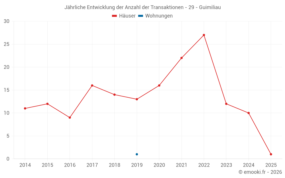 Der Durchschnittspreis auf den 19 Hausgeschäften der letzten 24 Monate in der Gemeinde Guimiliau betrug 1 510 € pro Quadratmeter für einen mittleren Immobilienwert von 115 000 €. Über diesen Zeitraum hinweg lagen 60% der Transaktionen zwischen 953 und 2 025 € pro Quadratmeter (vom 2. bis zum 8. Dezil).