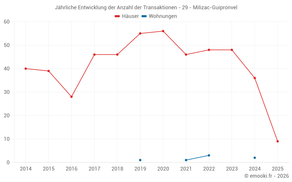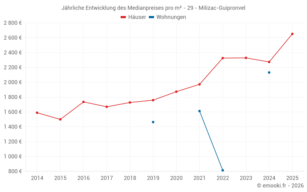 Der Durchschnittspreis auf den 29 Hausgeschäften der letzten 12 Monate in der Gemeinde Milizac-Guipronvel betrug 2 333 € pro Quadratmeter für einen mittleren Immobilienwert von 242 500 €. Über diesen Zeitraum hinweg lagen 60% der Transaktionen zwischen 1 757 und 2 791 € pro Quadratmeter (vom 2. bis zum 8. Dezil).