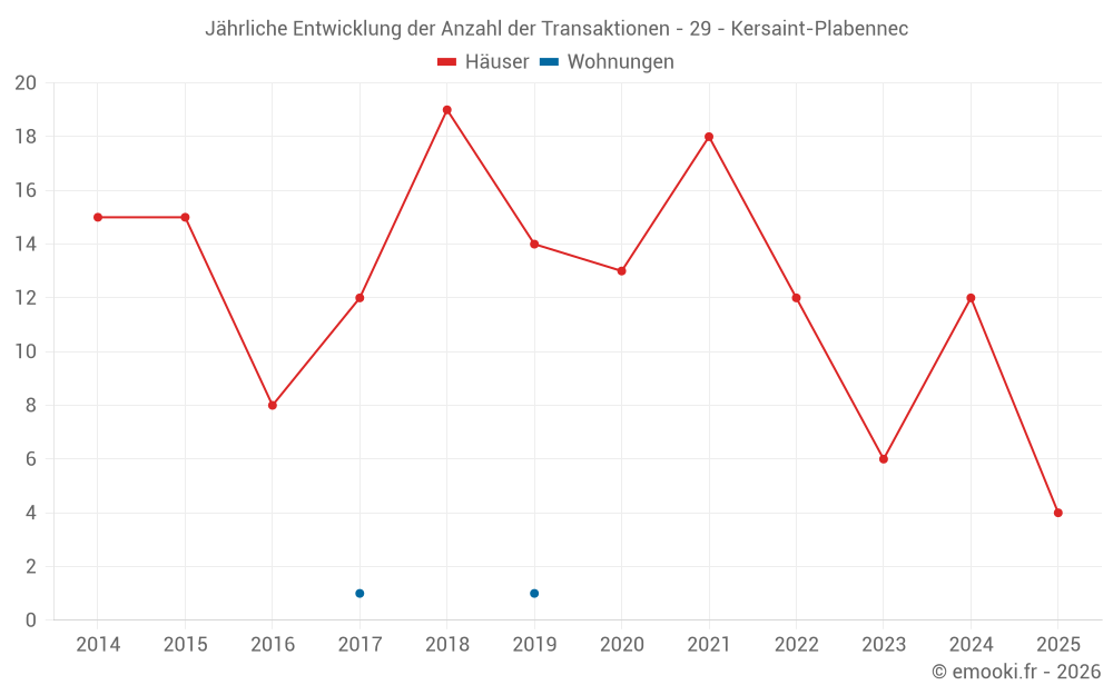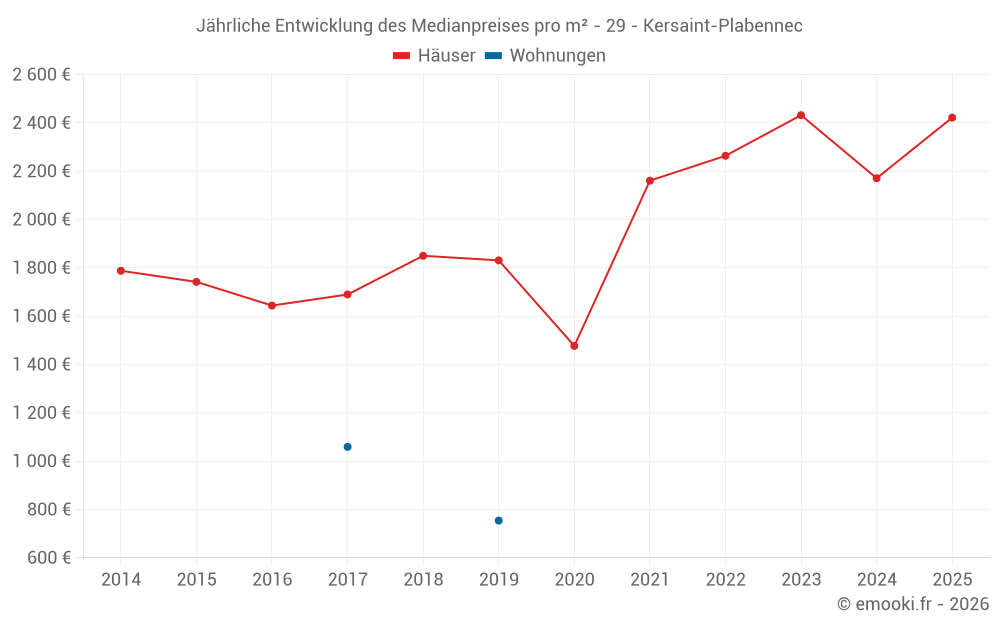 Der Durchschnittspreis auf den 18 Hausgeschäften der letzten 24 Monate in der Gemeinde Kersaint-Plabennec betrug 2 201 € pro Quadratmeter für einen mittleren Immobilienwert von 230 000 €. Über diesen Zeitraum hinweg lagen 60% der Transaktionen zwischen 1 551 und 2 851 € pro Quadratmeter (vom 2. bis zum 8. Dezil).