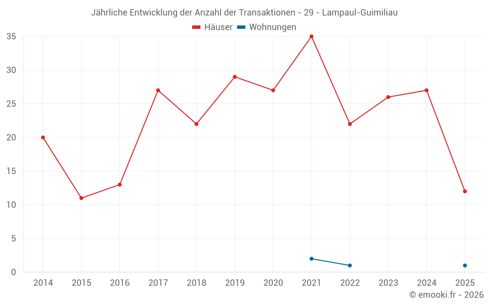 Der Durchschnittspreis auf den 26 Hausgeschäften der letzten 12 Monate in der Gemeinde Lampaul-Guimiliau betrug 1 608 € pro Quadratmeter für einen mittleren Immobilienwert von 131 325 €. Über diesen Zeitraum hinweg lagen 60% der Transaktionen zwischen 1 155 und 2 099 € pro Quadratmeter (vom 2. bis zum 8. Dezil).