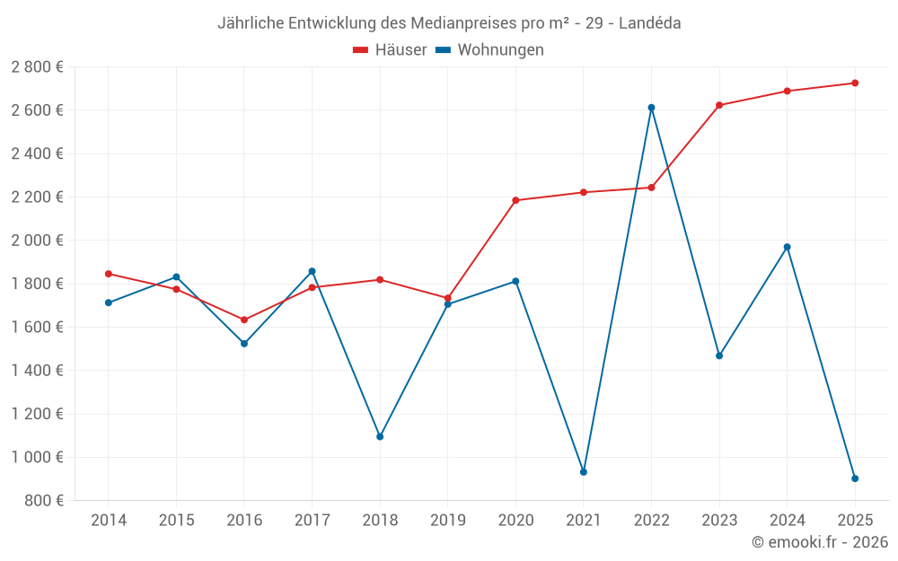 Der Durchschnittspreis auf den 41 Hausgeschäften der letzten 12 Monate in der Gemeinde Landéda betrug 2 697 € pro Quadratmeter für einen mittleren Immobilienwert von 270 000 €. Über diesen Zeitraum hinweg lagen 60% der Transaktionen zwischen 1 875 und 3 488 € pro Quadratmeter (vom 2. bis zum 8. Dezil).