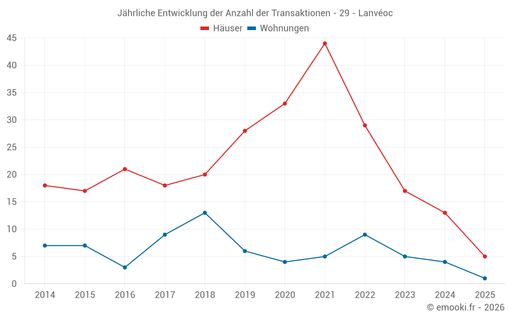 Der Durchschnittspreis auf den 26 Hausgeschäften der letzten 24 Monate in der Gemeinde Lanvéoc betrug 1 612 € pro Quadratmeter für einen mittleren Immobilienwert von 157 500 €. Über diesen Zeitraum hinweg lagen 60% der Transaktionen zwischen 1 046 und 2 889 € pro Quadratmeter (vom 2. bis zum 8. Dezil).