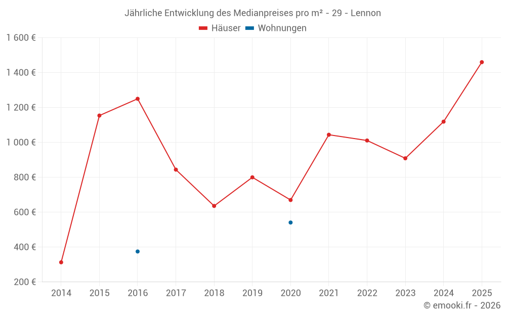Der Durchschnittspreis auf den 21 Hausgeschäften der letzten 24 Monate in der Gemeinde Lennon betrug 1 186 € pro Quadratmeter für einen mittleren Immobilienwert von 105 000 €. Über diesen Zeitraum hinweg lagen 60% der Transaktionen zwischen 743 und 1 731 € pro Quadratmeter (vom 2. bis zum 8. Dezil).