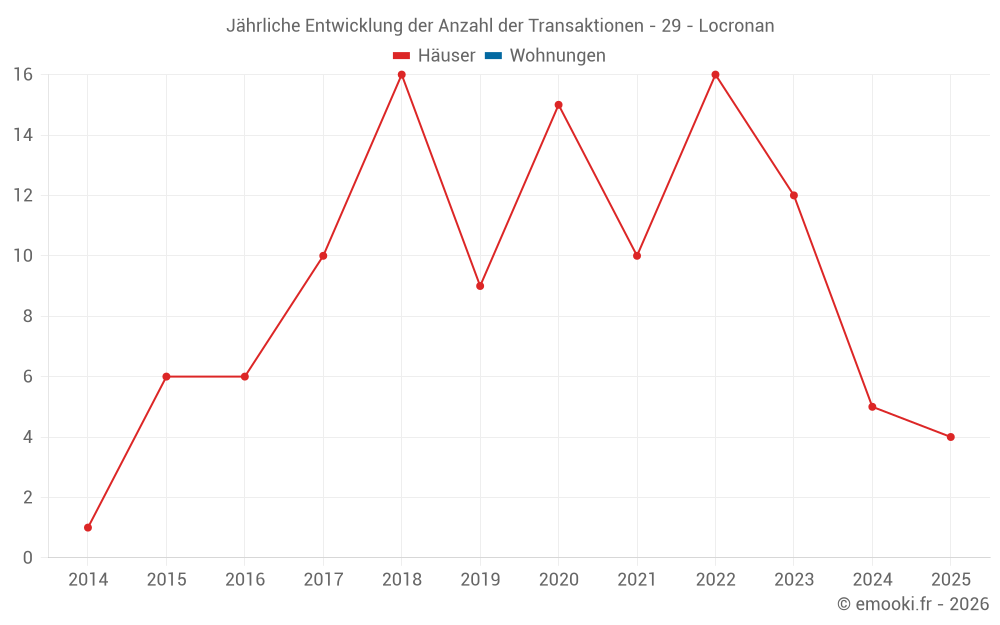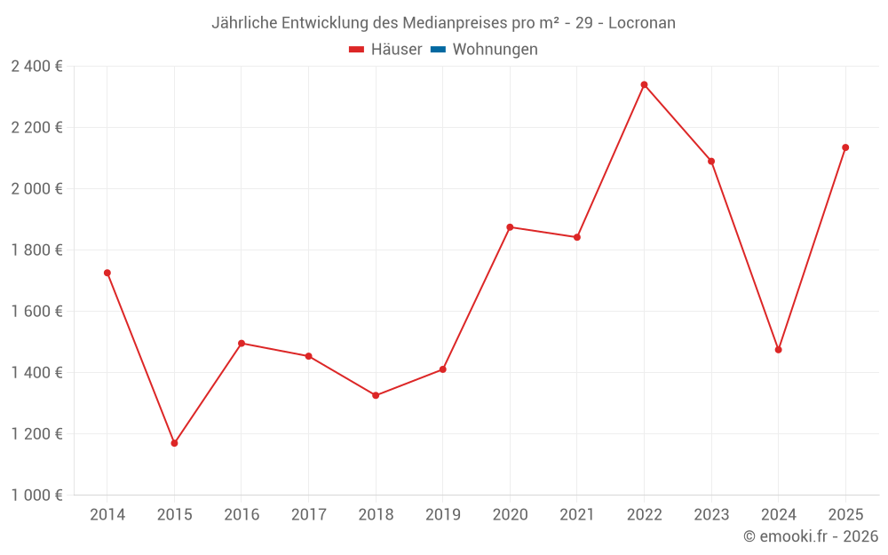 Der Durchschnittspreis auf den 16 Hausgeschäften der letzten 24 Monate in der Gemeinde Locronan betrug 2 090 € pro Quadratmeter für einen mittleren Immobilienwert von 147 800 €. Über diesen Zeitraum hinweg lagen 60% der Transaktionen zwischen 1 681 und 2 692 € pro Quadratmeter (vom 2. bis zum 8. Dezil).