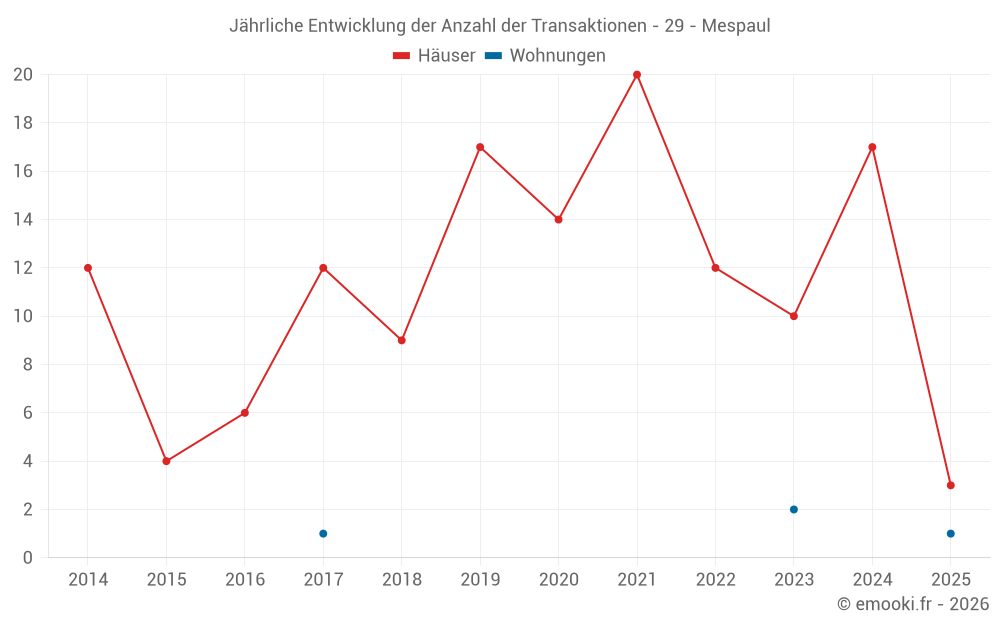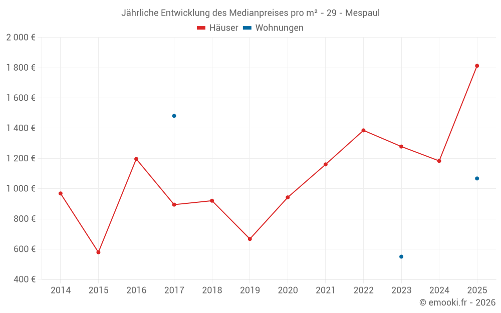 Der Durchschnittspreis auf den 22 Hausgeschäften der letzten 24 Monate in der Gemeinde Mespaul betrug 1 232 € pro Quadratmeter für einen mittleren Immobilienwert von 118 000 €. Über diesen Zeitraum hinweg lagen 60% der Transaktionen zwischen 884 und 1 902 € pro Quadratmeter (vom 2. bis zum 8. Dezil).